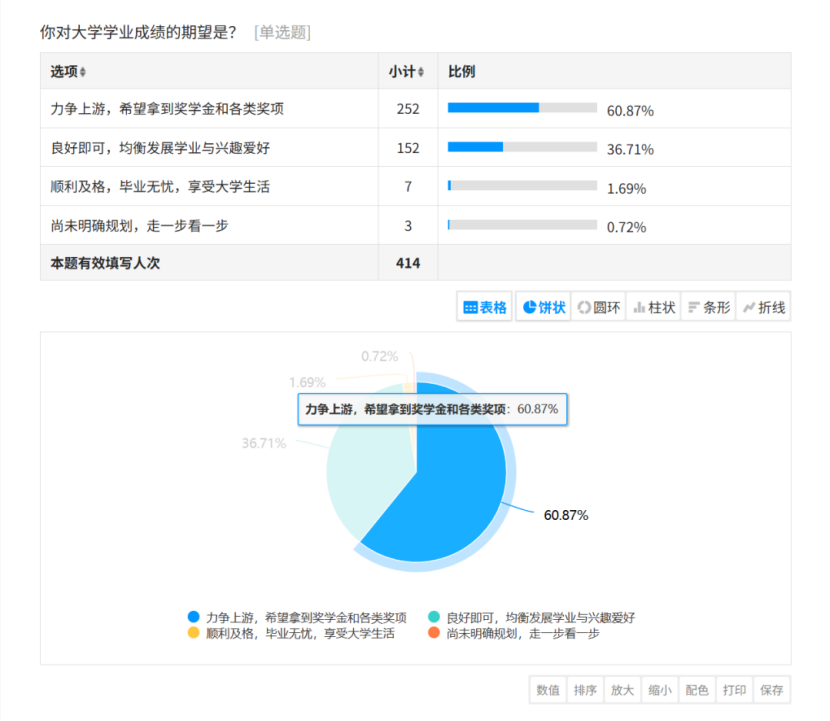 学业规划:令人欣喜的是,超过60%的新生表示有力争上游,希望拿到奖学金的和各类奖项意向,36%的同学希望学业和兴趣爱好均衡发展。