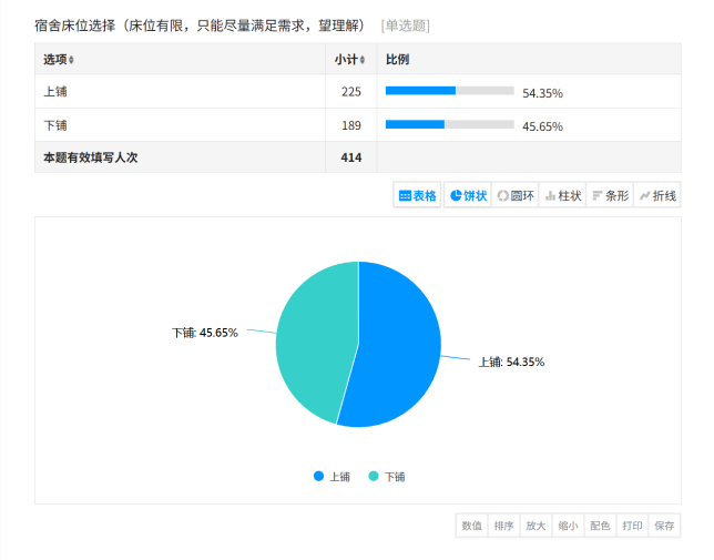 上下铺选择:54%的新生选择上铺,主要原因包括“上铺更加干净、私密性更好”;而45%选择下铺的同学则多因为“方便、安全”。