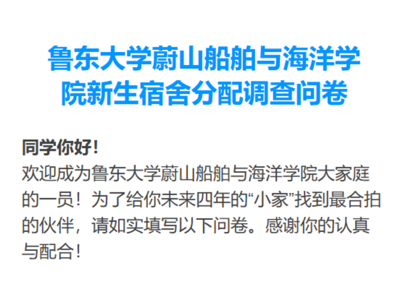 随着开学季的临近,鲁东大学蔚山船舶与海洋学院2025级新生宿舍分配工作正在有序进行。与往年不同,今年学院别出心裁地推出新生宿舍分配问卷调查,通过科学匹配为新生打造更加和谐的居住环境。本次问卷调查涵盖了兴趣爱好、作息时间、上下铺选择倾向、卫生习惯、睡眠质量和大学学业规划等多个维度,旨在为新生匹配到最合适的室友,帮助大家更快融入大学生活。