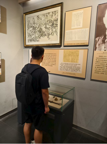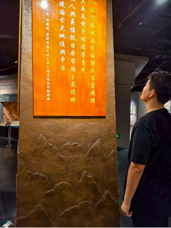 在纪念馆的战役复原展区,团队通过沙盘模型和动态投影,全面了解了台儿庄战役的战略意义。1938年春,中国军队以劣势装备血战日军精锐,用血肉之躯筑起民族长城。特别引人深思的是“敢死队夜袭敌营”场景,队员们驻足良久,被“宁死不退”的铁血精神深深震撼。穿过纪念馆主厅,一面由上千支军号组成的巨型装置墙扑面而来。这些历经战火洗礼的铜号整齐排列,在射灯照耀下泛着庄重的金属光泽,宛如一道用信仰浇筑的钢铁长城。讲解员动情地介绍,每支军号都代表着一次生死冲锋——有的号身布满凹痕,记录着号手在炮火中坚持传令的壮举;有的喇叭口变形开裂,见证着"人在号在"的誓言。当灯光模拟集结号声依次亮起时,整个空间仿佛回荡起穿越时空的冲锋旋律,队员们不约而同屏息肃立。队员李佳楷轻声念出墙上的铭文:"每声号响,都是永不妥协的民族宣言。"这面震撼人心的军号墙,不仅是对英雄的集体致敬,更化作催人奋进的时代号角,让在场所有人深刻体会到"听党指挥、使命必达"的精神传承。座谈会上,历史专业同学结合展板资料,分析了战役中体现的民族团结精神与战术智慧。这场以弱胜强的经典之战,不仅粉碎了日军速亡中国的妄想,更淬炼出“天下兴亡、匹夫有责”的爱国主义丰碑。